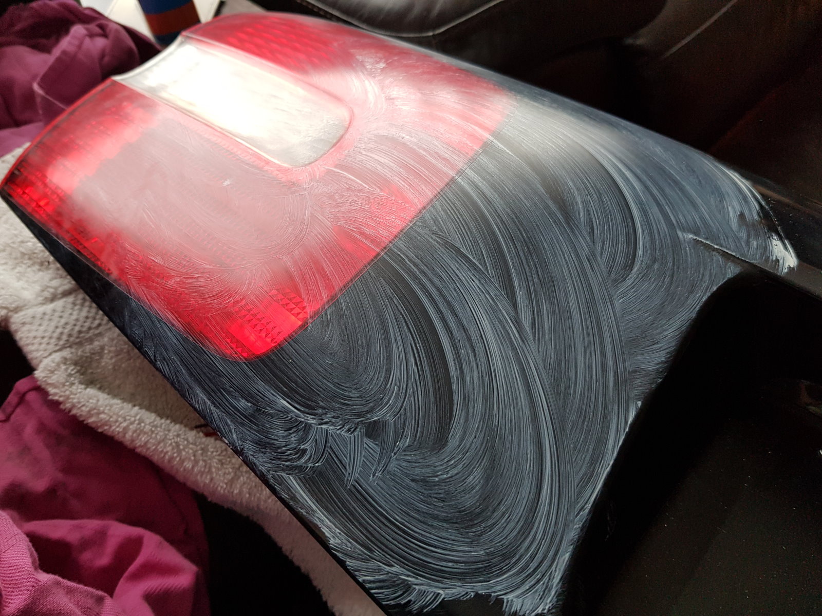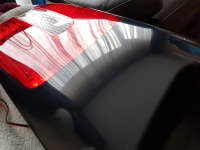 10-09-2018 Mooi nog tijd om de auto te poesten. 01 - Allereerst worden alle ongespoten kunsstofdelen met Lijnzaadolie behandeld. 02 - Dat brengt de mooie donkere kleur weer terug, zoals je hier op de twee helften kan zien. 03 - Dan is het achterlichtpaneel aan de beurt. Die wordt gepoetst met Commandant Scratch remover. Eerst flink inwrijven. 04 - En na het uitpoetsen glimt het weer als een malle. 05 - En zo is de kont ook weer erg mooi. 06 - Ook poets ik op dezelfde wijze een paar kleine schades uit de wagen. 07 - Sommige gaan er niet helemaal uit maar het is wel minder opvallend nu. |